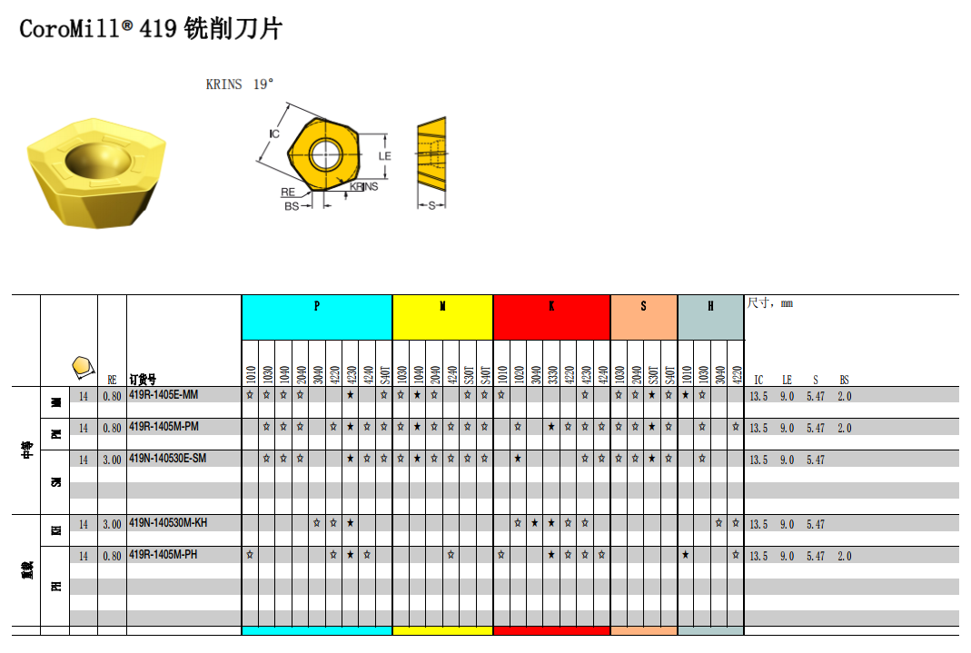 山特维克-铣削刀片-刀片形状P-高进给铣刀刀片-CoroMillⓇ 419铣削刀片系列-1片