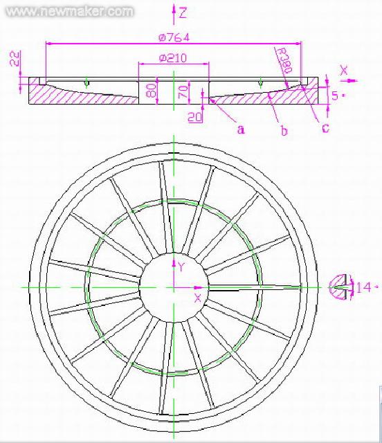该零件决定在带有FANUC 15M数控系统的3000V上加工。该加工中心为3MX1.1M工作台的龙门加工中心。槽锥度14°及槽底圆弧由球头成形铣刀加工保证,不考虑刀具半径补偿(加工坐标如图中所示)。本例只编制最终精加工程序,之前的粗加工则可以通过该程序在Z方向上的抬刀来实现。