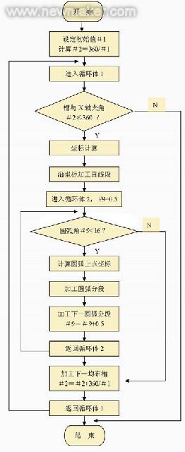 根据程序流程图可编写出零件的加工程序如下: |