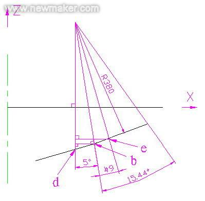 图2中,b点为R380与直线切点,其极半径已求出;#9为圆弧上待求点圆心角变量。由图可先求得:d点极半径=282.417-380sin5°=249.298,高度Z=-34.478-(380/cos5°-380cos5°)=-37.376,则e点极半径=249.298+380sin(5°+#9),高度Z=-37.376+(380/cos5°-380cos(5°+#9))