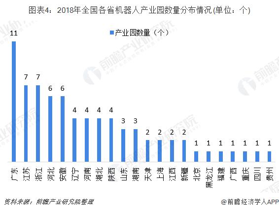 截止至2018年底,我国机器人产业园共有74个,产业园建设呈现出“全面开花,区域集中”的特点。其中广东省和江苏省各占11个和7个,领先全国,合计占全国产业园数量的24.32%。