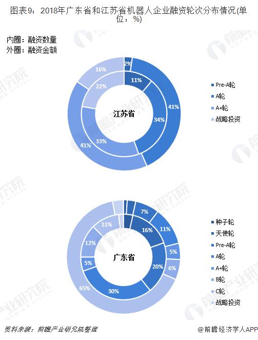 而从融资轮次分布情况来看,二省均偏早期,但广东省机器人企业融资阶段更靠后,资本也更偏好较为发展更成熟的头部企业,处于C轮融资阶段的企业数量虽只占数量的11%,却获得了2018年65%的融资额;而江苏省机器人企业集中分布于A轮(包括A+轮)及以前,融资数量占比达到78%。