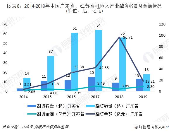 资本是推动机器人产业发展的又一大关键力量。根据IT桔子数据,2014-2019年,我国机器人产业资本市场上,无论从融资数量还是从融资金额来看,广东省均略胜一筹。2018年,广东省机器人产业融资数量为56起,而江苏省仅有9起;融资金额上,广东省融资金额达到96.71亿元,而江苏省仅为3.89亿元,是广东省的1/25。