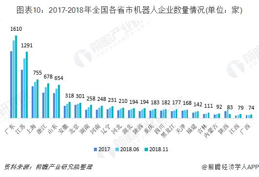 根据不完全统计,截止到2018年10月底,全国机器人企业的总数为8399家,9、10月全国范围新增企业数量为398家,2个月增幅为4.74%。其中,广东省和江苏省企业数量分别为1610和1291家,居全国前两名,广东省再次在数量上略胜一筹。对比2017年的数据,江苏省机器人企业增长了37.34%,增长速度较快,继续在总量上追赶广东。