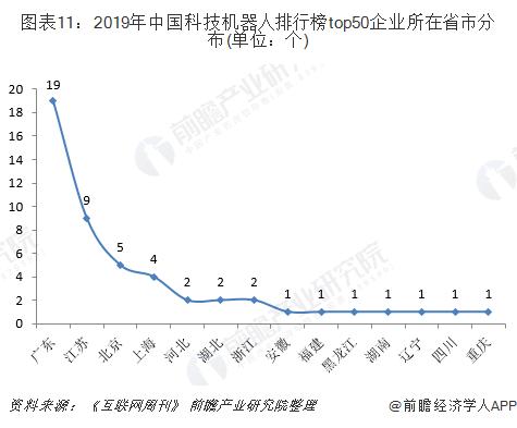 从企业实力来看,根据《互联网周刊》评选的2019年中国科技机器人排行榜top50企业省份分布情况,广东省上榜19家,占比38%,全国排名第一,实力大幅度领先;江苏省虽排在第二位,但仅上榜9家,占比18%,落后广东。