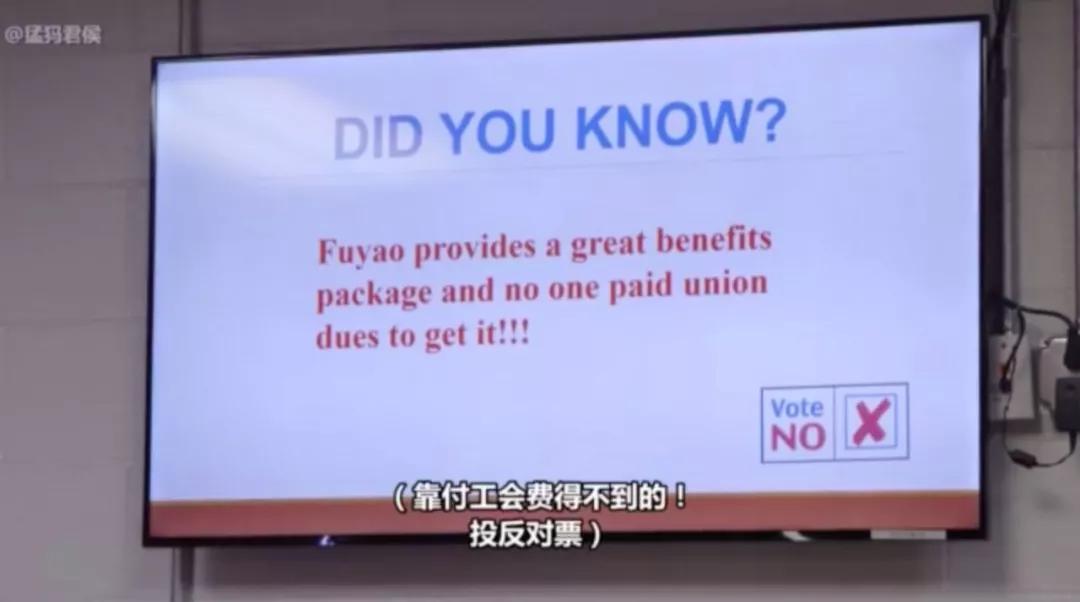 福耀花费100万美元聘请了劳资关系研究所,举办多场演讲来说服工人慎重考虑成立工会的后果,还针锋相对地在工人中发起了“vote no”运动。
