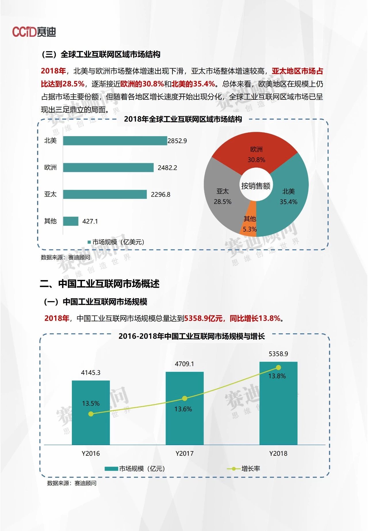 近日,赛迪顾问发布了2018年工业互联网市场数据的报告。报告显示,2018年,全球工业互联网市场规模达到8059.1亿美元,同比2017年增长5.5%。其中,2018年,中国工业互联网市场规模总量达到5358.9亿元,同比增长13.8%。