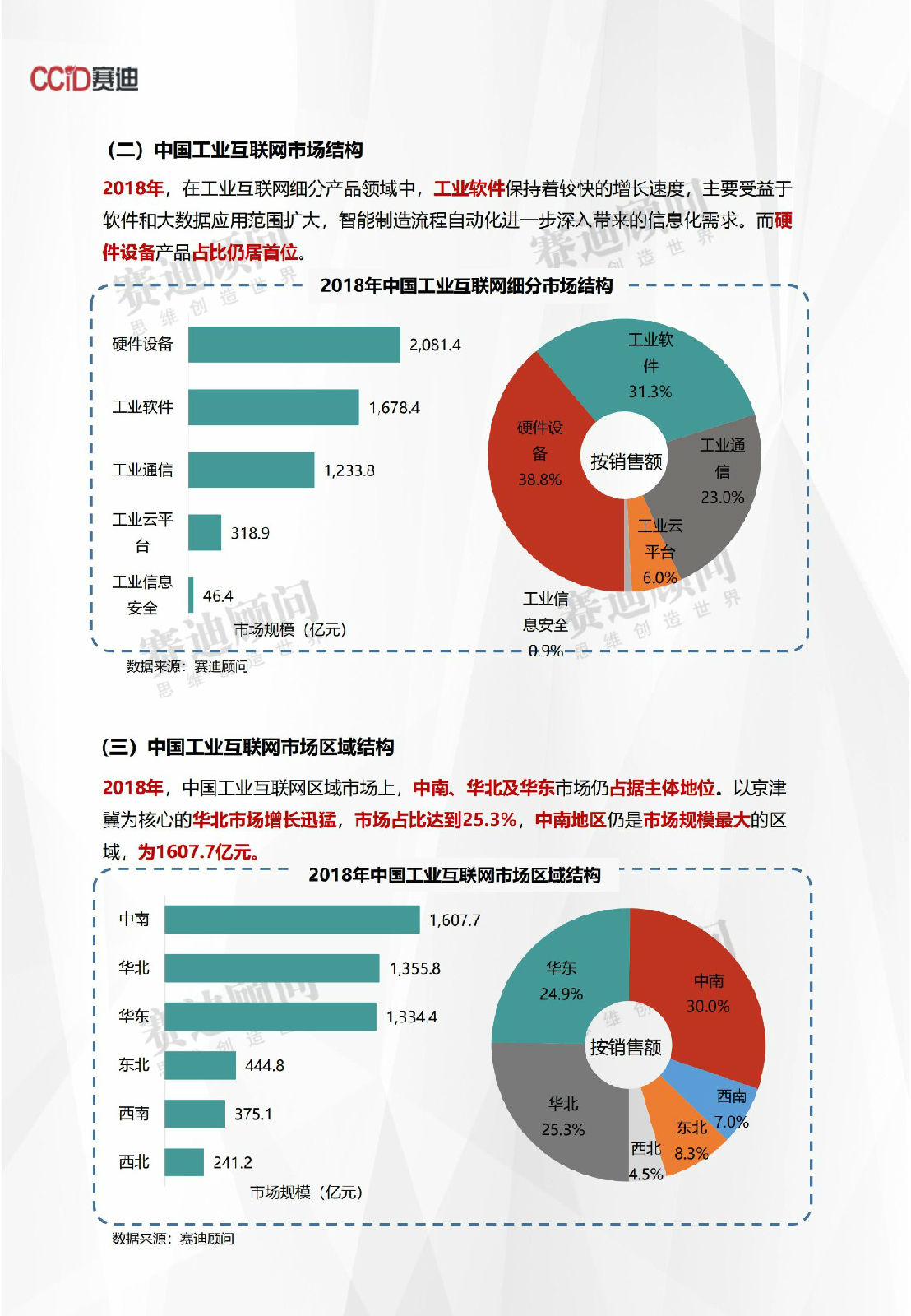 此外,中国在2018年工业互联网区域市场上,中南、华北及华东市场仍占据主体地位。以京津冀为核心的华北市场增长迅猛,市场占比达到25.3%,中南地区仍是市场规模最大的区域,为1607.7亿元。