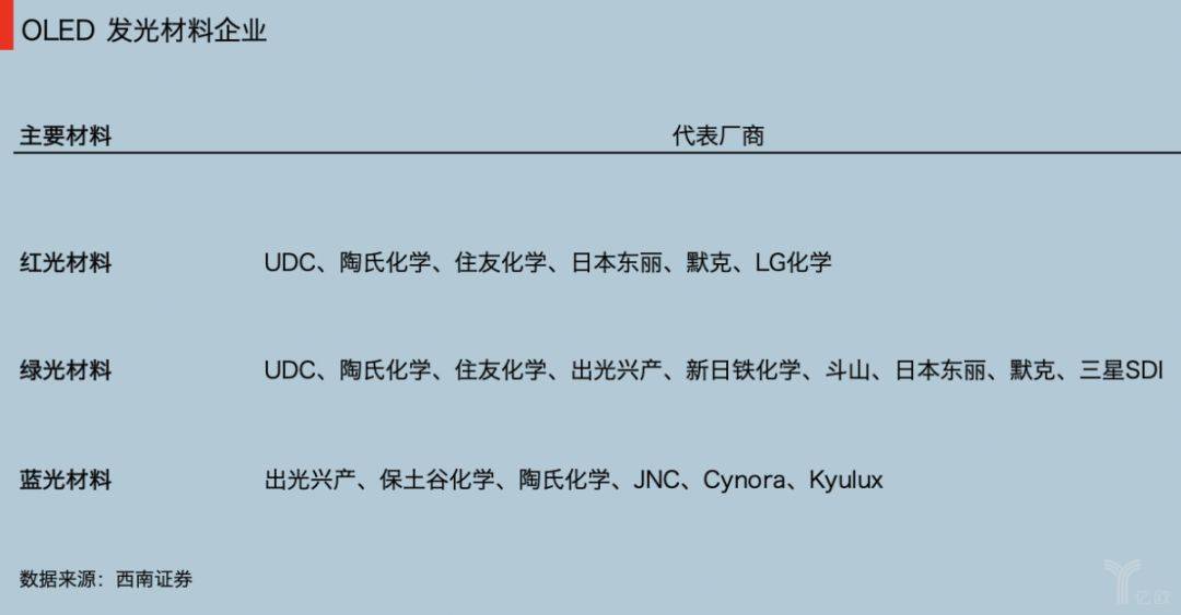 1.上游是材料和设备,平均毛利率50%往上走。主要有玻璃基板、发光材料、蒸镀机等核心材料和设备。