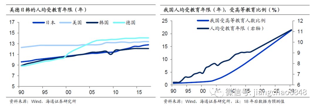 教育提升人口素质。但是反过来说,因为收入水平的提升,所以大家养育小孩也更加精细了,未来一代中国人的人口素质必然会大幅提升。统计表明,发达国家都拥有相对较高的受教育水平,韩国的人均GDP跨过1万美元之后,虽然人口出生率大幅下降,但是靠着教育水平的大幅提升,经济依然维持了不低的增长。而中国目前每年毕业的大学生数量超过1200万,这意味着未来00后可能每人都是大学生,中国的大学生人数比率有希望在10年之内翻一番,而人均受教育年限有望从目前的9.2年提升至11年以上,相当于全体中国人从一个初中生变成了高中生,受教育水平平均每年提升2%左右,这其实可以媲美过去每年2%的劳动力数量增加。