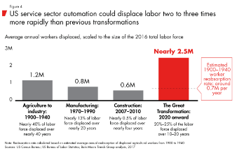 贝恩咨询公司 2018 年发布的报告 《劳动力 2030》就因探讨了自动化对社会环境的冲击而备受关注,报告预测到 2030 年,自动化的普及将减少当前 20%-25% 的工作岗位,也就是说有 4000 万人的工作会被机器取代,这还只是在美国。