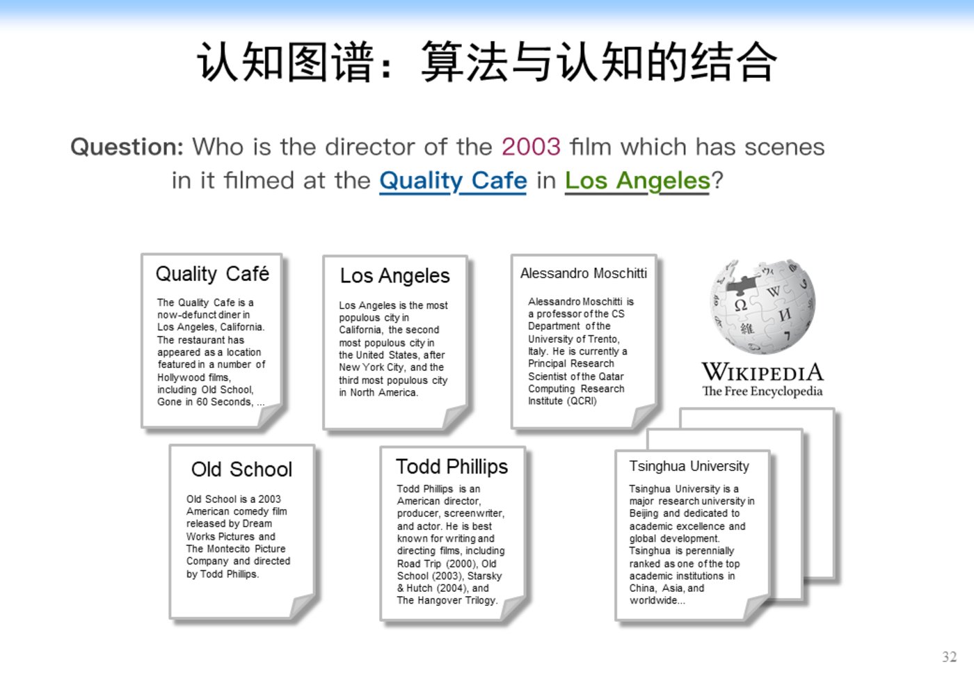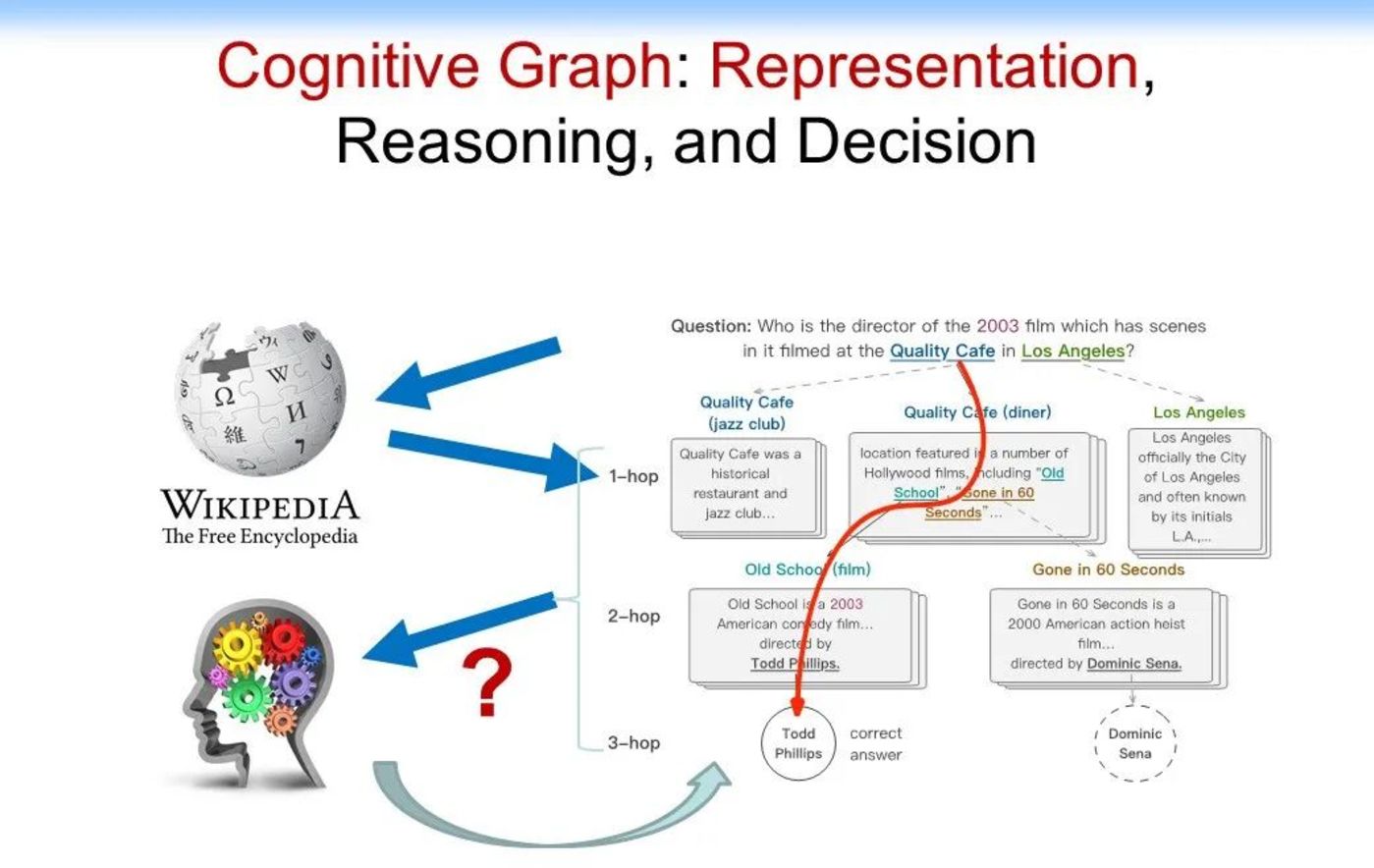相信很多人对认知图谱都比较陌生,这里我们举一个例子来说明一下。假如我们要解决一个问题“找到一个 2003 年在洛杉矶的 Quality 咖啡馆拍过电影的导演(Who is the director of the 2003 film which has scenes in it filmed at The Quality Cafe in Los Angeles)”。如果是人来解决这个问题的话,可能是先追溯相关的文档,如 Quality 咖啡馆的介绍文档,洛杉矶的维基百科页面等,我们可能会从中找到相关的电影,如 Old School ,在这个电影的介绍文档里面,我们可能会进一步找到该电影的导演 Todd Phillips,经过比对电影的拍摄时间是 2003 年,最终确定答案是 Todd Phillips,具体流程如下图所示: