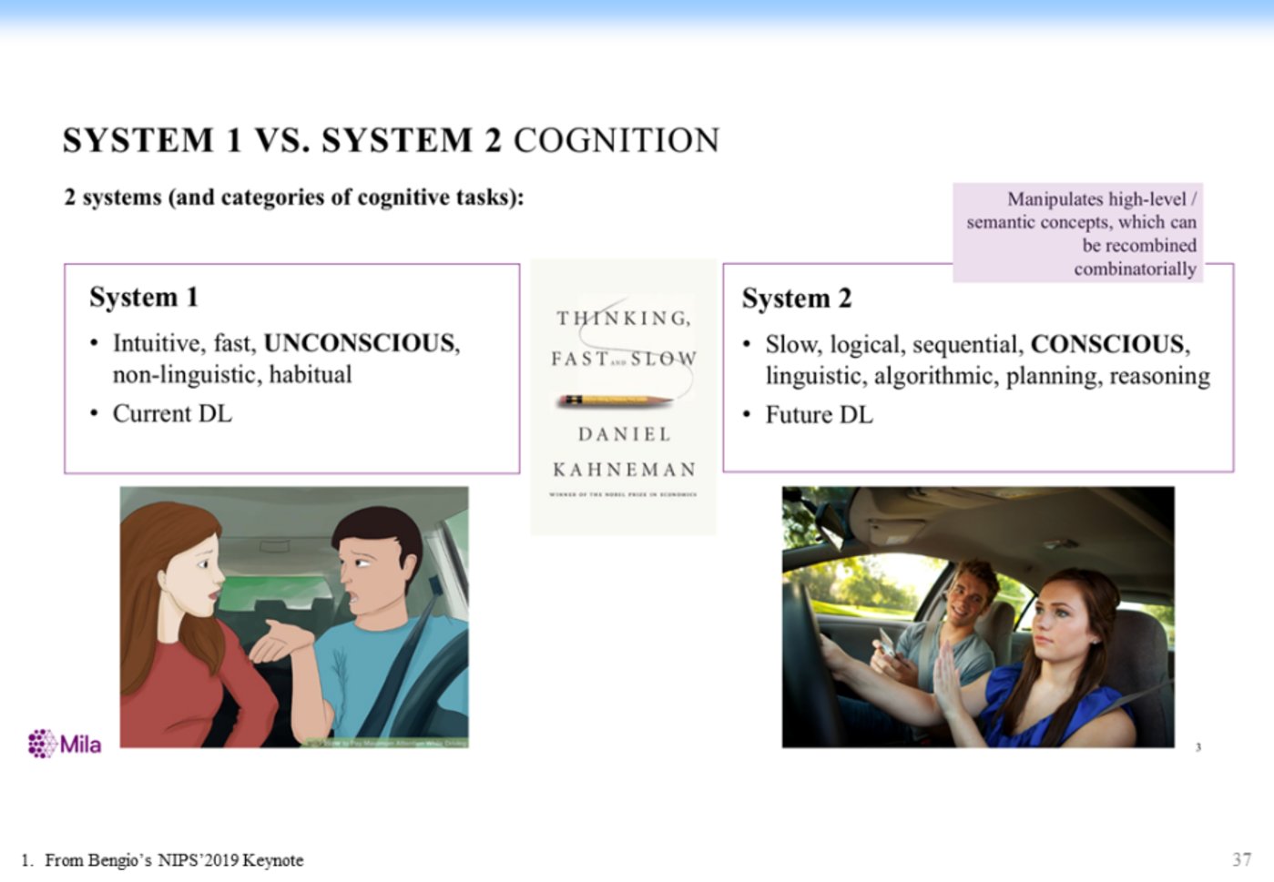 在去年的 NIPS 上,图灵奖获得者 Bengio 在大会主旨报告的 Keynote 也提到,System 1 到 System 2 的认知是深度学习未来发展的重要的方向,如下图所示: