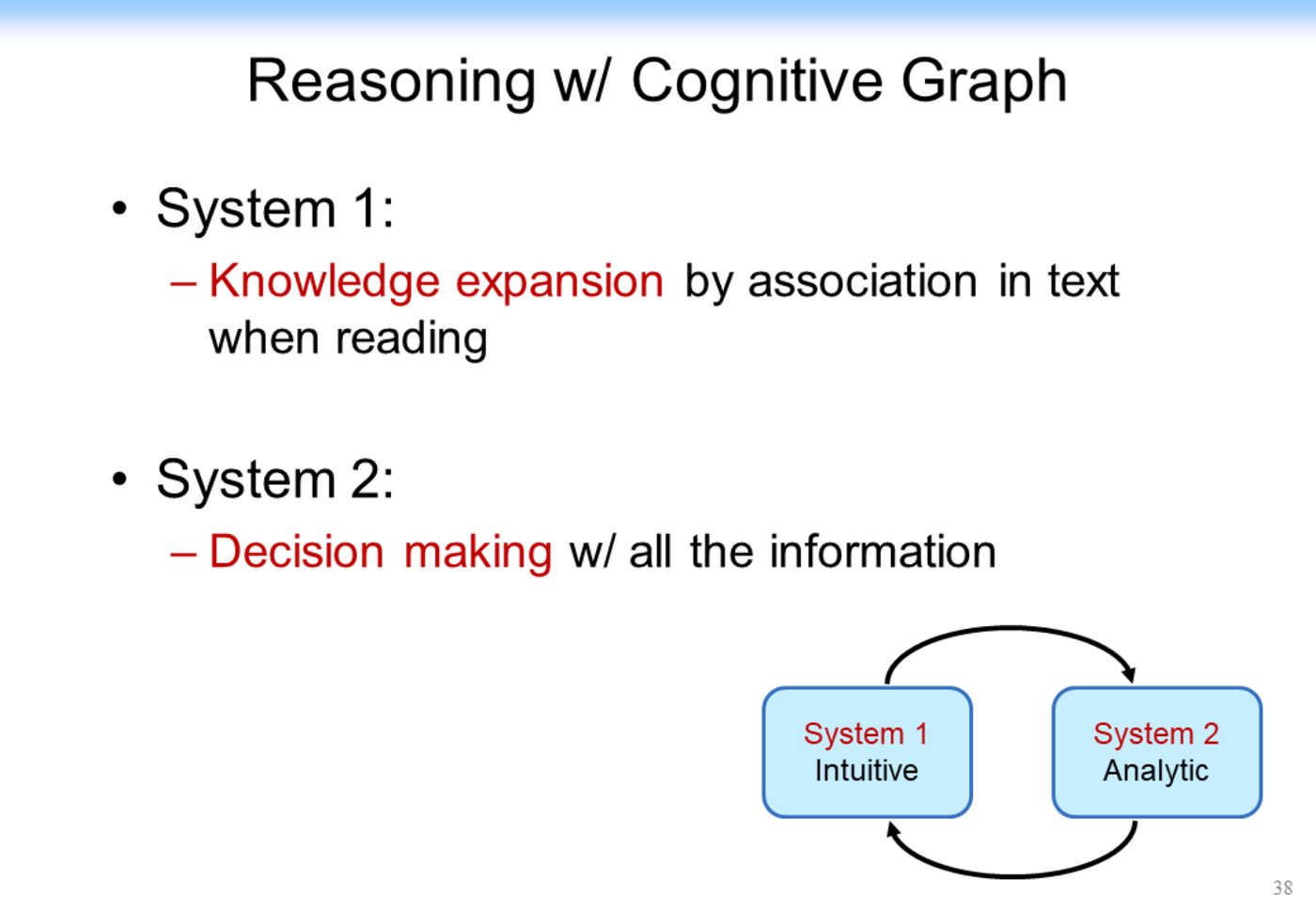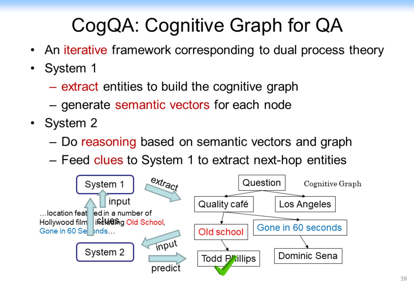 可以看到,我们在 System 1 中做知识的扩展,比如说针对前面的问题,我们首先找到相关的影片,然后用 System 2 来做决策。如果是标准答案,就结束整个推理的过程。如果不是标准答案,而相应的信息又有用,我们就把它作为一个有用信息提供给 System 1,System 1 继续做知识的扩展,System 2 再来做决策,直到最终找到答案。