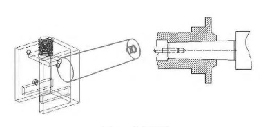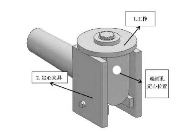 结构图中U形板跟零件3定位块是定位装置。在装夹辅助加工时,工件倒放,开口跨过横版,利用外圆端面,与U形板上表面实现端面孔心的定位,定位块侧靠工件,使得孔心与机床加工轴心同轴。具体定位如图7。