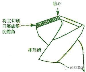 钻头两刃磨好后,两刃锋尖处会有一个平面,影响钻头的中心定位,需要在刃后面倒一下角,把刃尖部的平面尽量磨小。方法是将钻头竖起,对准砂轮的角,在刃后面的根部,对着刃尖倒一个小槽。这也是钻头定中心和切削轻快的重要一点。注意在修磨刃尖倒角时,千万不能磨到主切削刃上,这样会使主切削刃的前角偏大,直接影响钻孔。