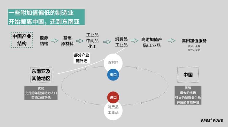 伴随着中国人口结构的老龄化,年轻人在减少,再加上劳动力成本增加,都使得我们在承接大规模的、低附加值、极度人口密集型的生产制造方面不具有优势。而东南亚等新兴国家,有更廉价的劳动力与规模可观的年轻人口。