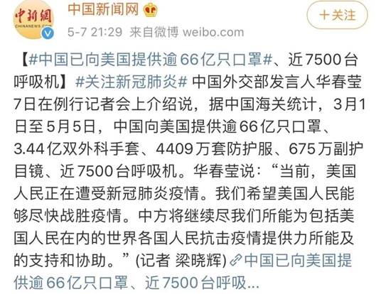 从3月1日到5月5日,中国已向美国提供了超过66亿只口罩,3.44亿双外科手套、4409万套防护服、675万副护目镜、近7500台呼吸机,帮助美国的医院,挽救了大量的生命。
