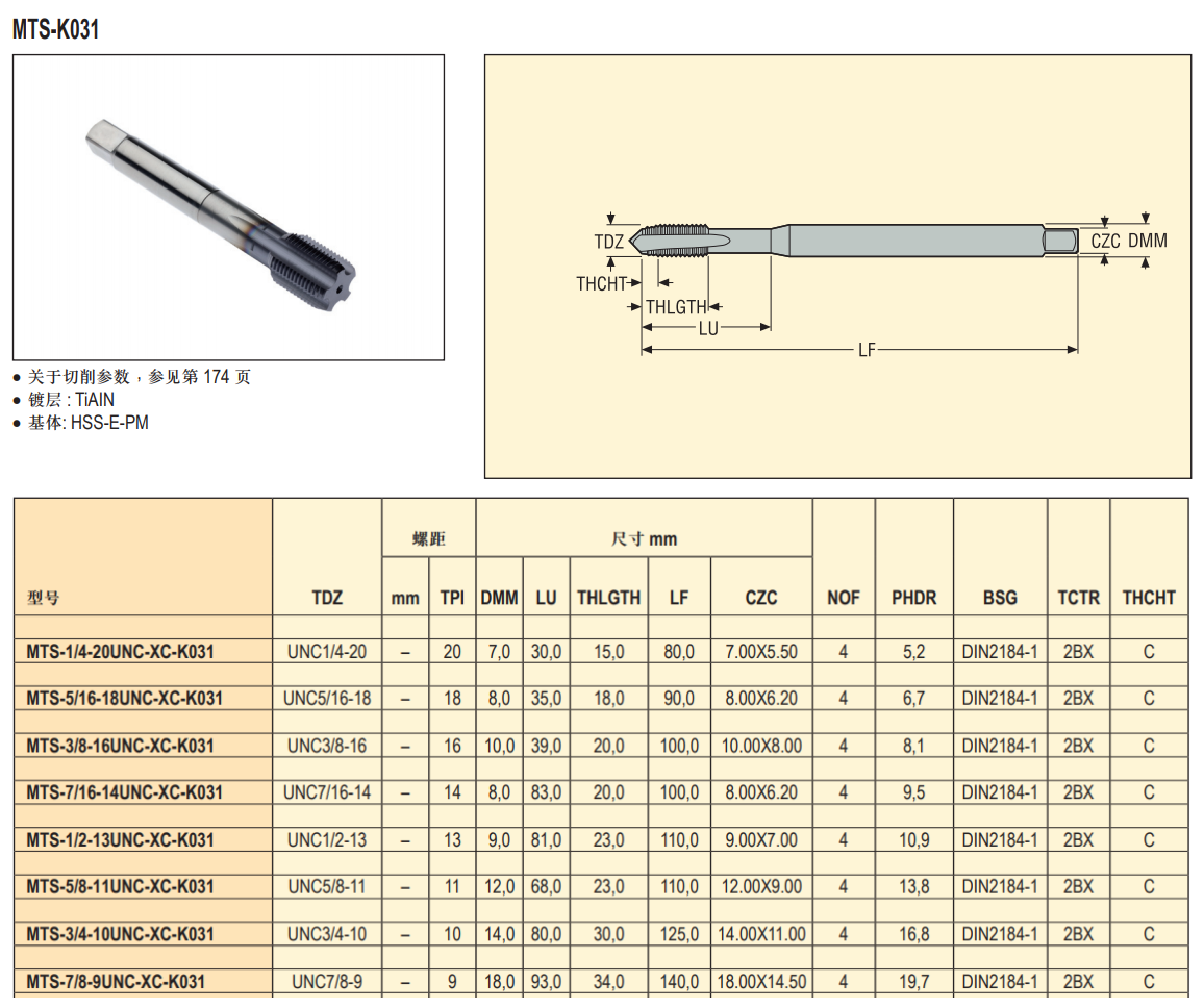 山高-直槽丝锥-盲孔和通孔-美制粗牙螺纹-进入倒角C型-铸铁-刀具型号31系列-1把