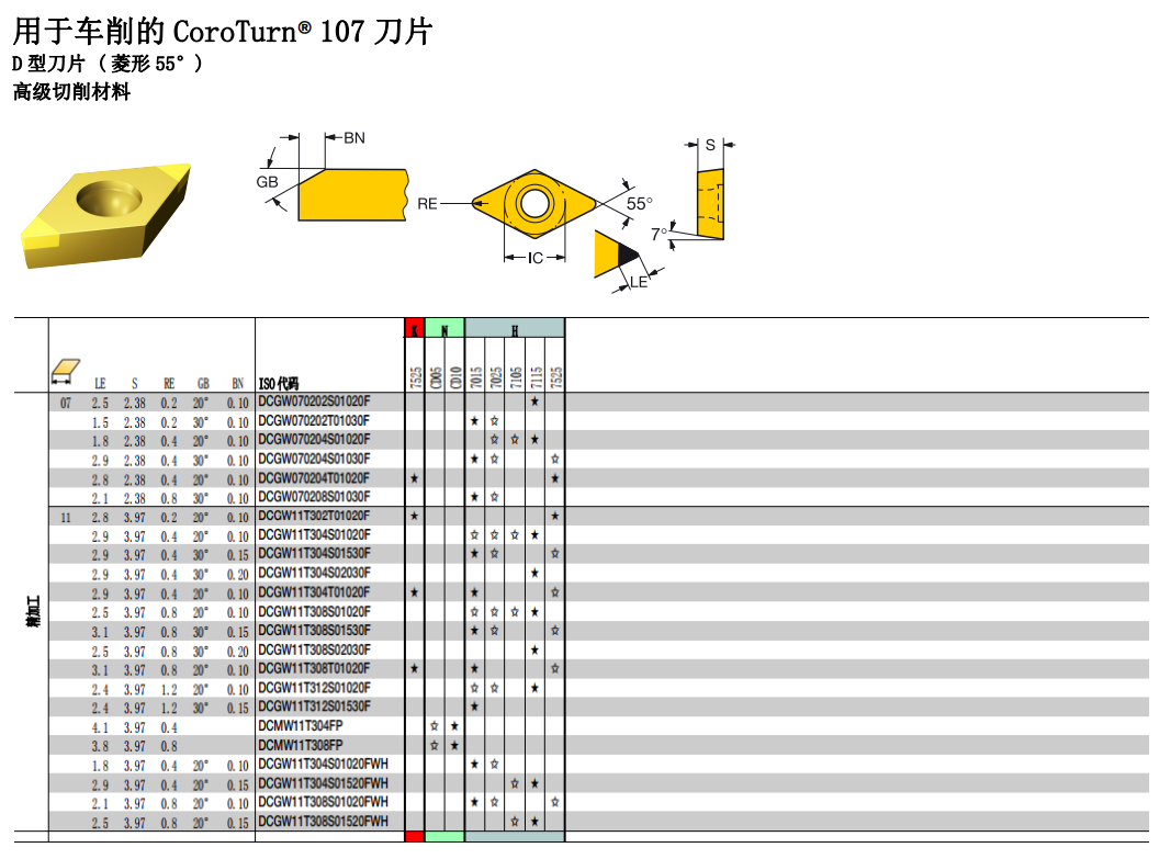 山特维克-CoroTurnⓇ 107车削刀片-刀片形状D-菱形55°-后角7°-高级切削材料-刀片类型D系列-1片
