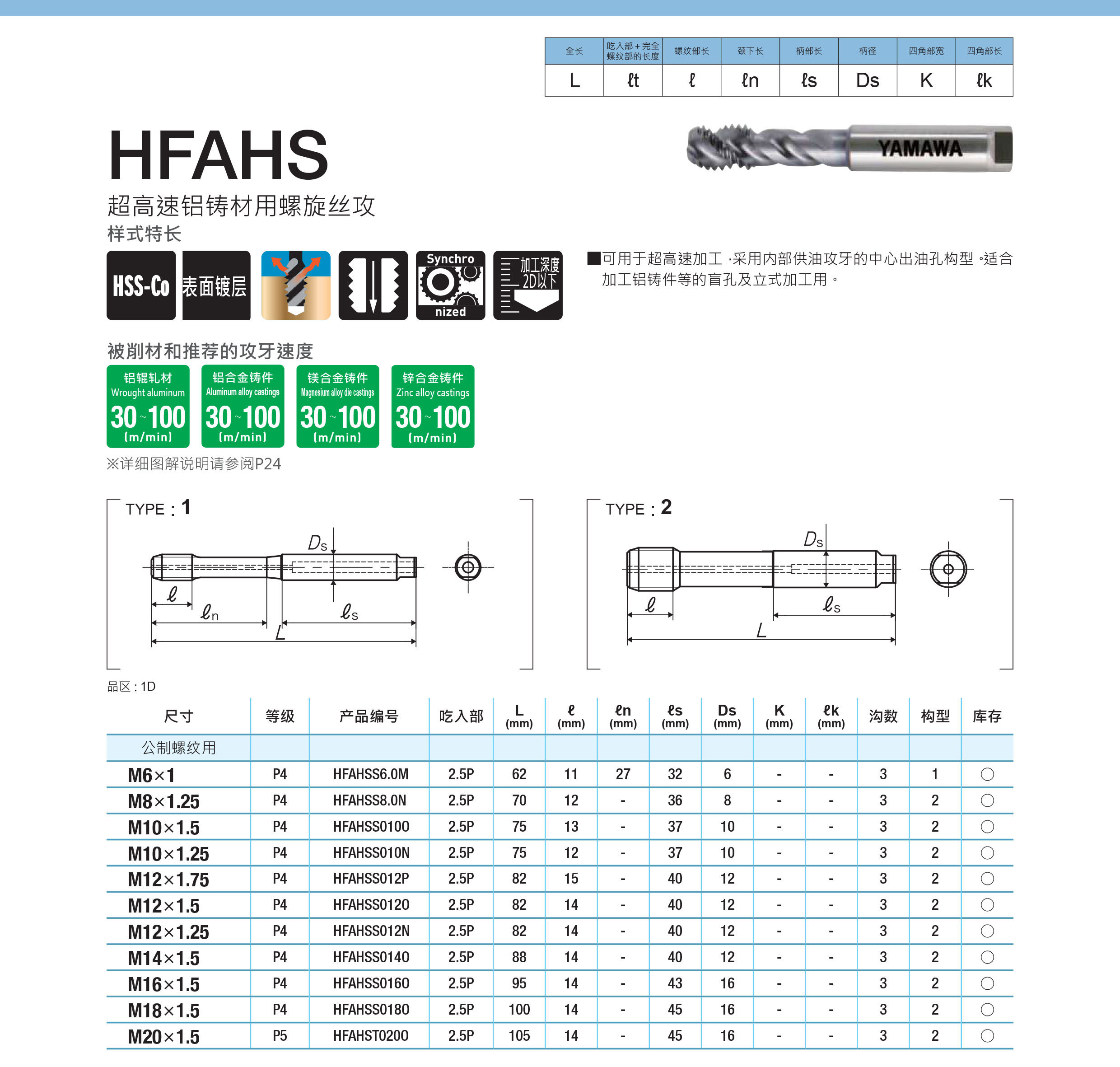 刀具-丝锥板牙-螺旋槽丝锥-螺旋丝锥-YAMAWA(盲孔用)-HFAHS系列-1把