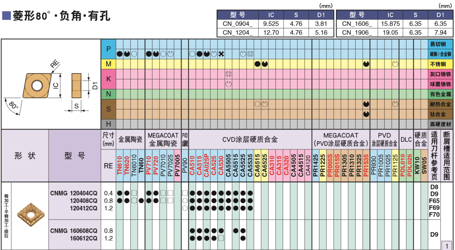京瓷-车削刀片-菱形80°-负角-有孔-CVD涂层-钢件-CQ断屑槽型-1片
