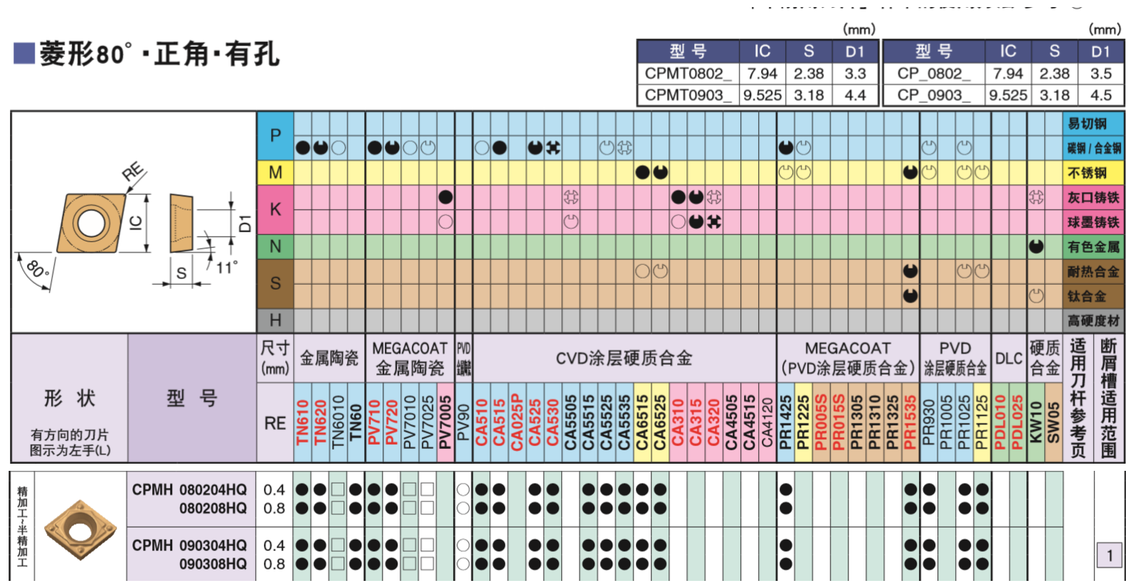京瓷-车削刀片-菱形80°-正角-有孔-金属陶瓷-钢件-HQ断屑槽型系列-1片