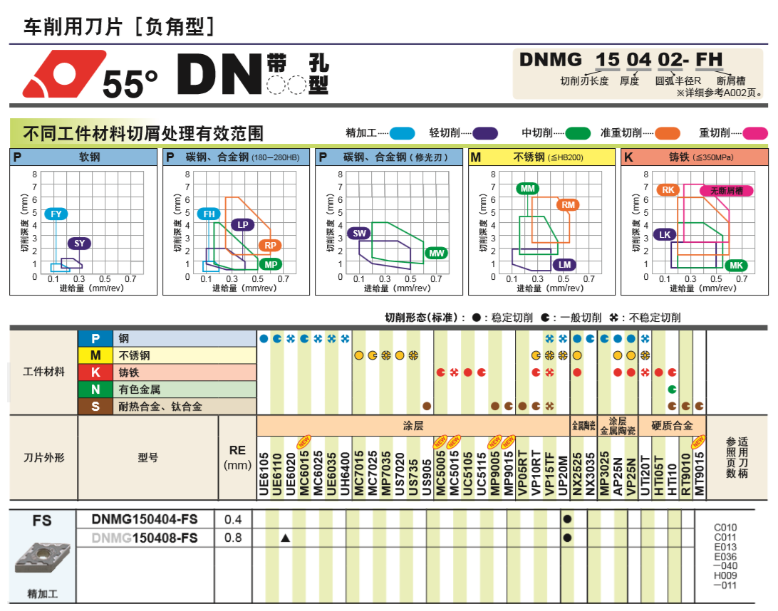 三菱-车削刀片-负角型-55°-DN带孔型-FS断屑槽型-钢件-铸铁-不锈钢-通用加工系列-1片