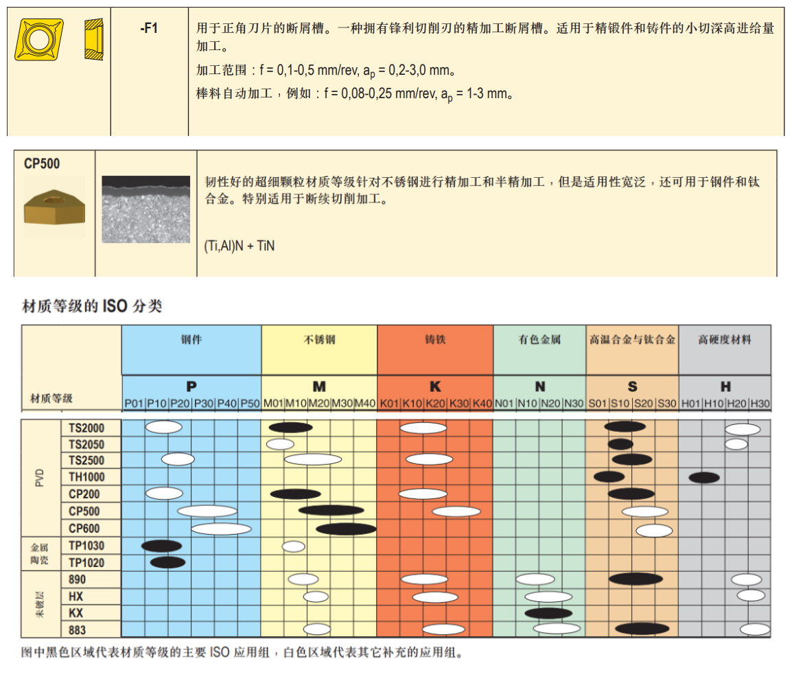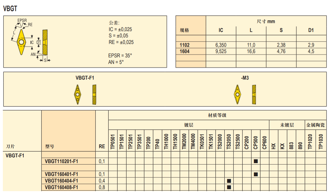 山高-车削刀片-刀片形状V型-刀片后角5°-夹持和断屑槽T型-正角刀片-断屑槽F1系列-镀层CP500-1片